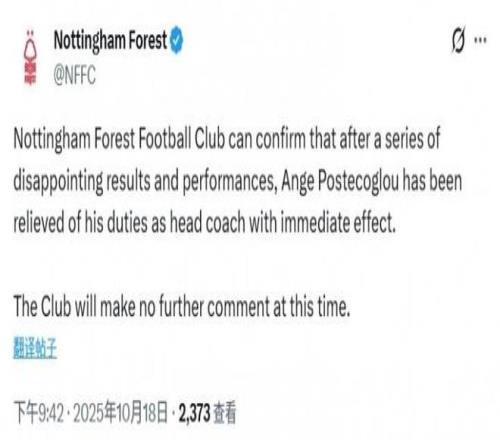 诺丁汉森林宣布,“由于近期一系列令人失望的比赛结果与场上表现,波斯特科格鲁已立即不再担任球队主教练一职。”