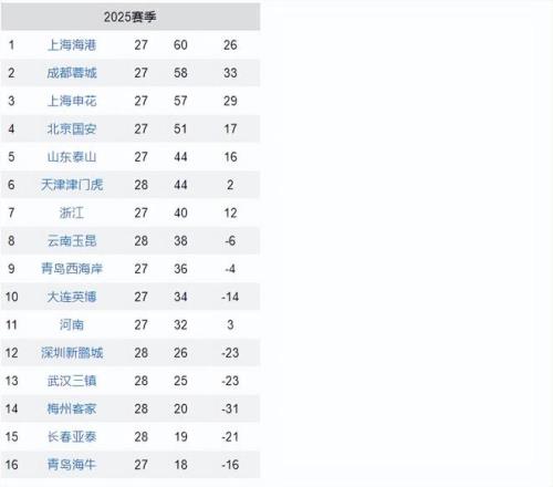 中超最新积分榜