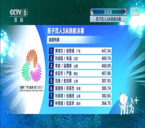 金牌+1,广东队谢思埸黄博文跳水男子双人3米板夺冠
