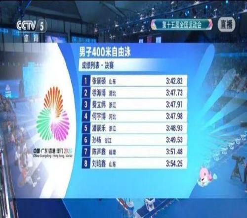 湖北选手徐海博获得亚军,浙江选手费立纬排名第三。潘展乐以3分48秒93位列第五。另一位浙江名将孙杨以3分49秒53名列第六。