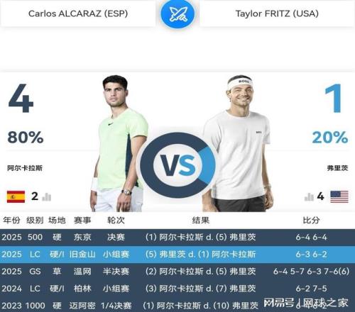 生于1997年、身高1米96的弗里茨,发球势大力沉,正手进攻火力凶猛,反手进攻和切削近几年得到显著提升,实在是一名竞争力非常突出的选手。2022年印第安维尔斯大师赛决赛,弗里茨两盘战胜西班牙战神纳达尔,夺取职业生涯第一个大师赛冠军;2024年美网,弗里茨职业生涯首次闯进大满贯决赛,荣获亚军。职业生涯至今,阿尔卡拉斯和弗里茨交锋五次,取得了四胜一负的佳绩,殊为不易。