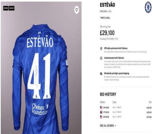 切尔西球员帕尔默与埃斯特旺成为该平台上的热门人物。帕尔默在去年对布莱顿比赛中攻入四球的那件球衣最终以34411英镑成交,而埃斯特旺在对阿贾克斯比赛中打进个人第一粒欧洲冠军联赛进球的球衣则卖出29100英镑。