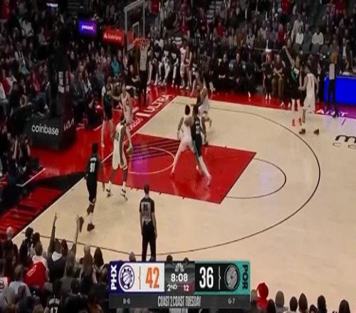 第三节开拓者卡马拉拿下6分,太阳伊戈达罗拿下8分,第三节结束开拓者82-100落后太阳