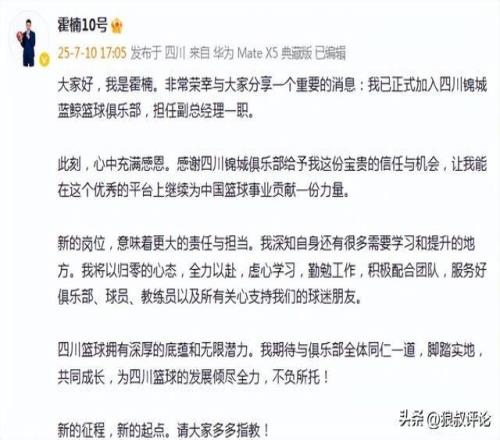 此前四川男篮深陷财务压力的风波当中,曾有媒体报道霍楠早与四川男篮分道扬镳,如今更是社媒发声也是一种回应,他目前仍与四川男篮同一阵线。