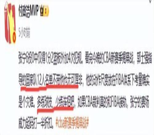 赛后付政浩发文称,郭士强指导的国家队12人名单不带他也无可厚非,他的动作尺度放在FIBA体系下考量确实是个灾难。多练球技、少练连招吧,如果CBA裁判真的和FIBA接轨,张宁的赛场威力起码打一半折扣。山西球迷接受不了这一评价,“仅凭一场比赛就能得出这样的结论吗?有点武断了吧。”付政浩正色道:这还武断?看了他四个赛季了,动作一年比一年离谱。其实完全可以去跨界UFC试试。