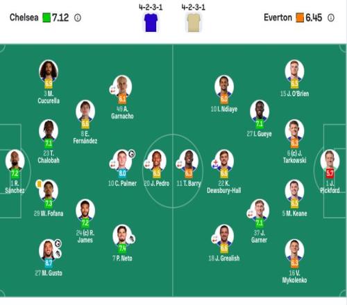 切尔西首发:1-桑切斯、3-库库雷利亚、23-查洛巴、29-福法纳、27-古斯托、24-詹姆斯、8-恩佐、10-帕尔默(57’17-桑托斯)、7-内托、20-若昂·佩德罗(81’41-埃斯特旺)、49-加纳乔(65’11-吉滕斯)。