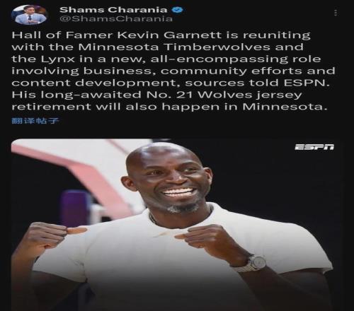 爆料王Shams:加内特重返森林狼,担任一个全新角色,涉及商业运营、社区活动和内容开发等活动,并且他的21号球衣将在明尼苏达举行退役仪式。