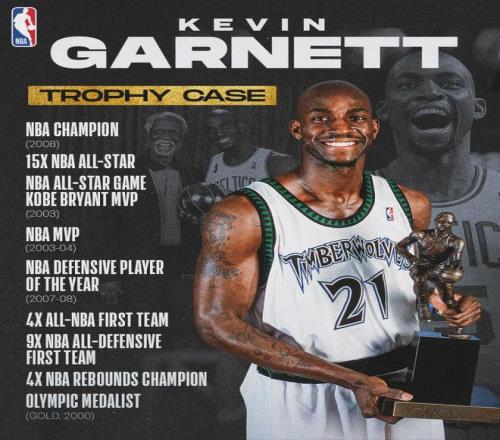 整个NBA生涯,加内特可谓是荣誉满身,获得过1次MVP,1次拿到总冠军,1次当选DPOY,9次最佳阵容&12次最佳防守阵容,4次荣获篮板王,15次入选全明星,2020年评为名人堂成员,1次帮助美国男篮拿到奥运会金牌等等。
