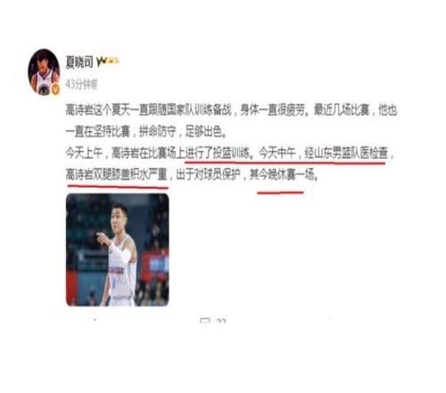 根据山东记者夏晓司表示,高诗岩虽然是参加了投篮训练,但是,根据队医的检查,他的双腿膝盖积水严重,为了保护他,因此,本场比赛不会高诗岩参加,让他可以进行休养一下。