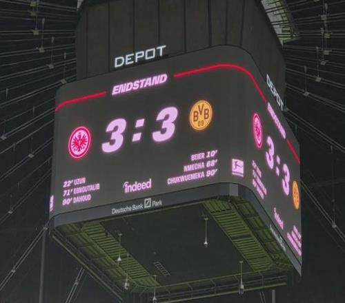 凌晨三点半的德意志银行公园球场,当达胡德在92分钟的抽射划破夜空,法兰克福球迷的欢呼几乎要掀翻看台;可仅仅三分钟后,丘库埃梅卡的一脚推射,又让主场的喜悦瞬间凝固。3-3,这场德甲第16轮的巅峰对决,用最极致的反转演绎了足球的魅力,也为法兰克福这支常年被“遗憾”笼罩的球队,刻下了一道兼具悲情与微光的印记。