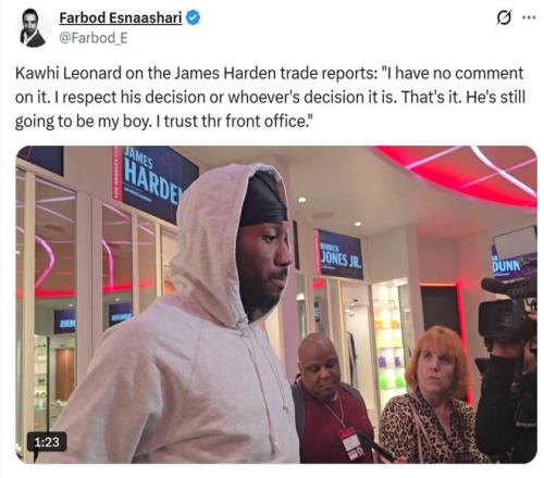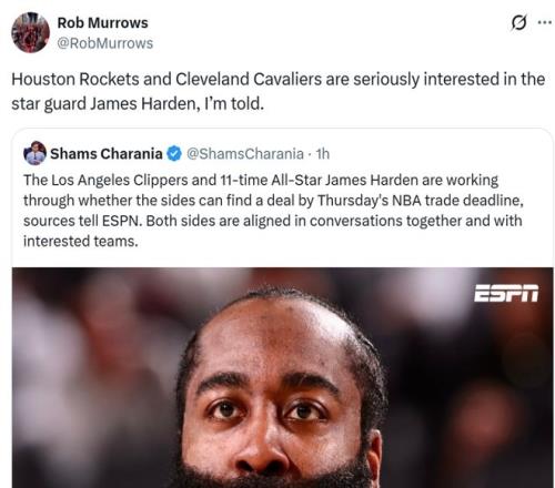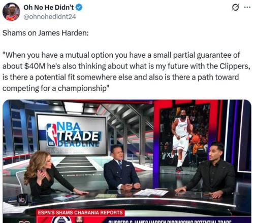 ESPN名记Shams随后发文确认消息真实性,同时跟进表示哈登与快船双方都在讨论能否在交易截止日前离队,并且双方都在寻找感兴趣的下家进行讨论。