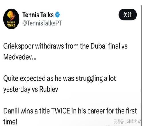 “这不是我想赢得决赛的方式,”梅德韦杰夫在确认对手退赛后,于X平台发文写道,“希望格里克斯普尔的伤势不重,祝他早日康复” 。这位30岁的俄罗斯名将整届赛事未失一盘,用完美的表现等待着一个本应完美的句号,却等来了意外的退赛大礼和窗外呼啸的防空警报。