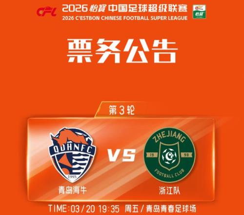 3月20日(星期五)19:35,在2026赛季中超联赛第3轮的一场关键争夺中,青岛海牛坐镇主场青岛青春足球场,迎战浙江队。赛前,青岛海牛发布了此役的票务公告。